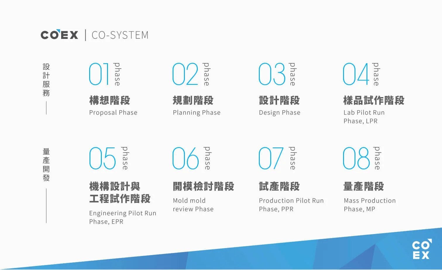 Co-System 是以豐富設計與製造實務經驗作為基礎延伸出的服務流程,COEX 擁有多年國際化量產製造經驗,Co System 透過彈性多元化的服務項目與有企圖心的企業合作,藉由共創加值的服務精神,讓產品概念得以落實。