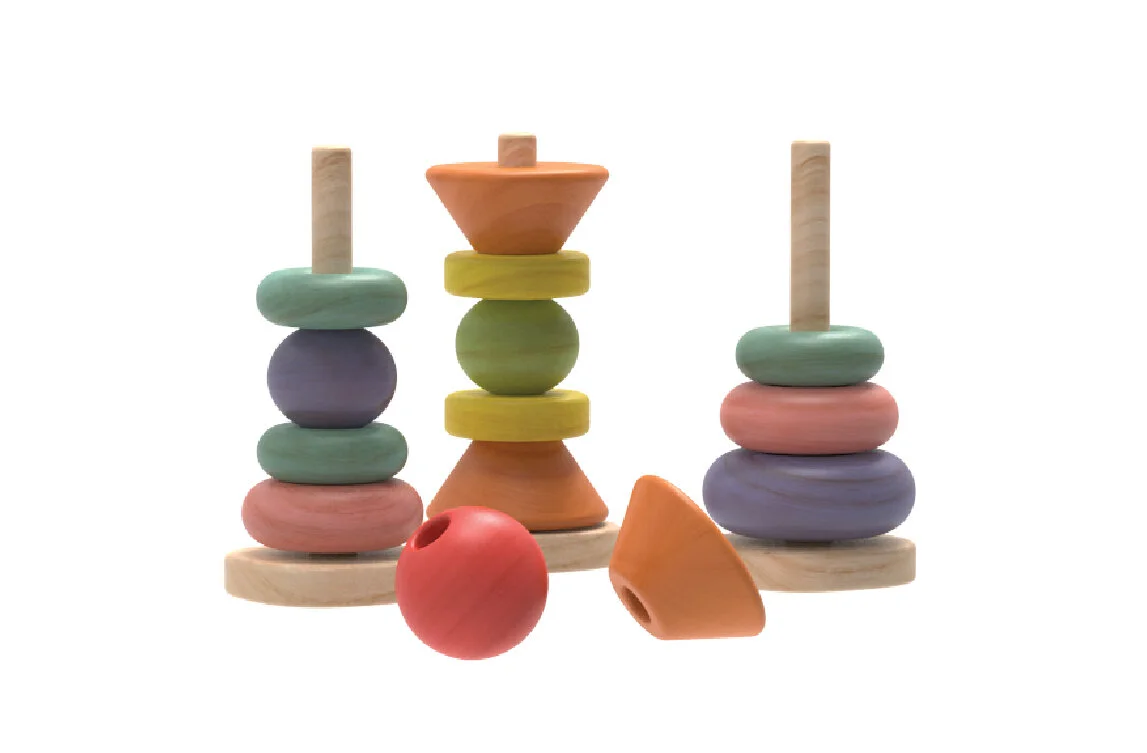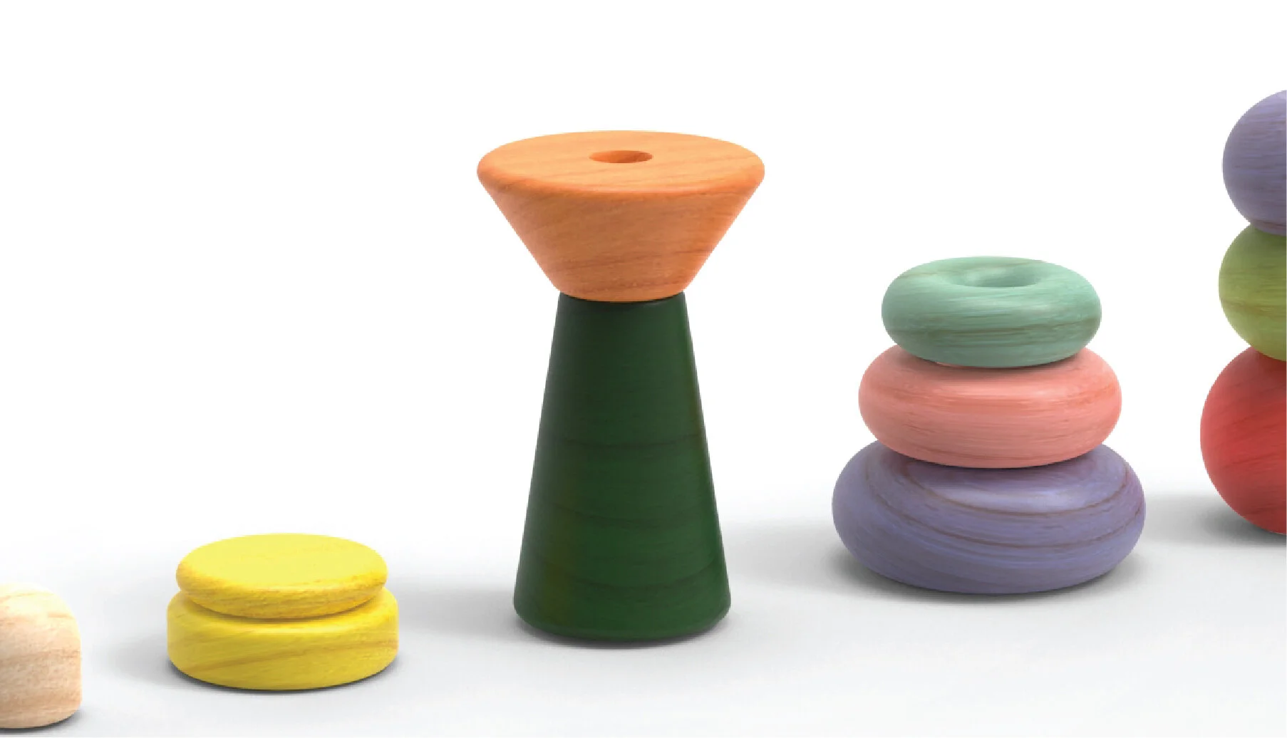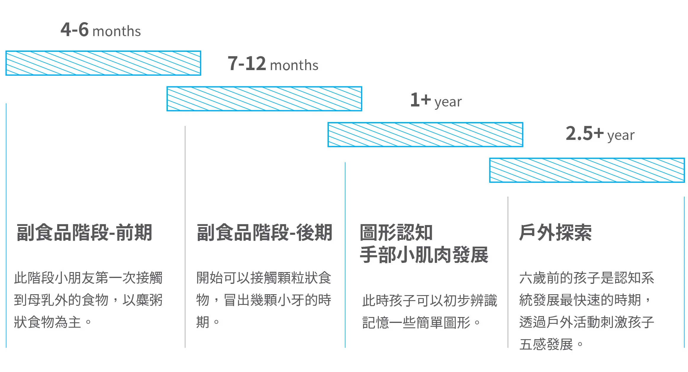 當孩童渡過了副食品階段,BELLO提供成長教育配件,我們將積木設定為不同大小,讓孩子練習抓握外,同時亦可以訓練手眼協調,將積木套入木棒中。