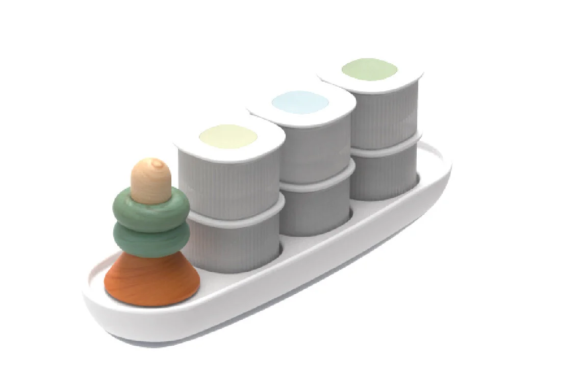副食品分裝盒採用食品級矽膠做為容器材質,容器符合寶寶成長階段所需份量,如需餵食可微波加熱,容器本身亦為為食餐碗,從分裝到餵食無須更換容器,降低父母親的負擔。